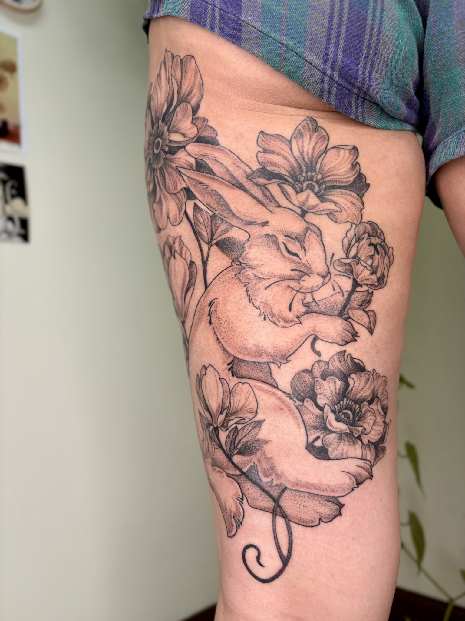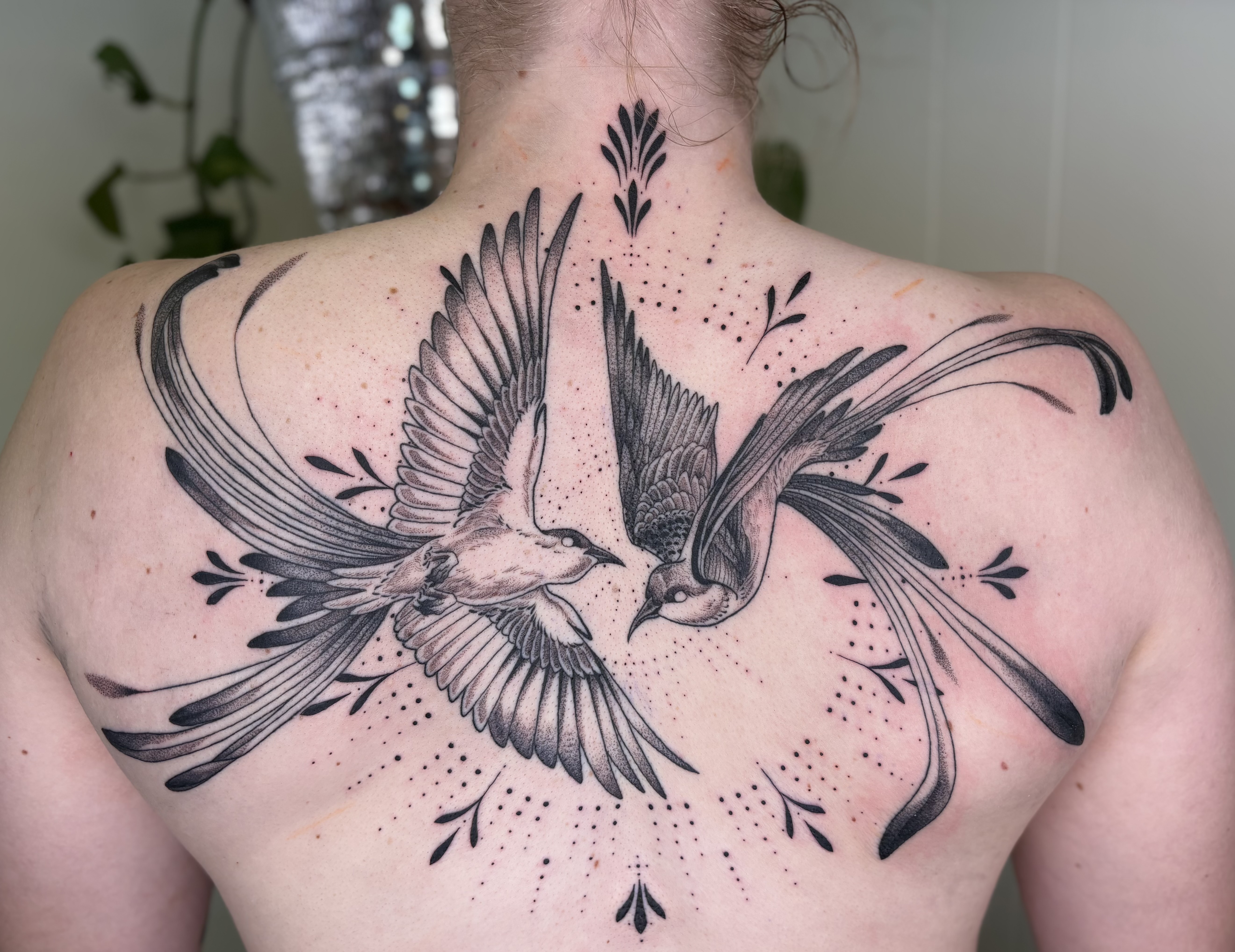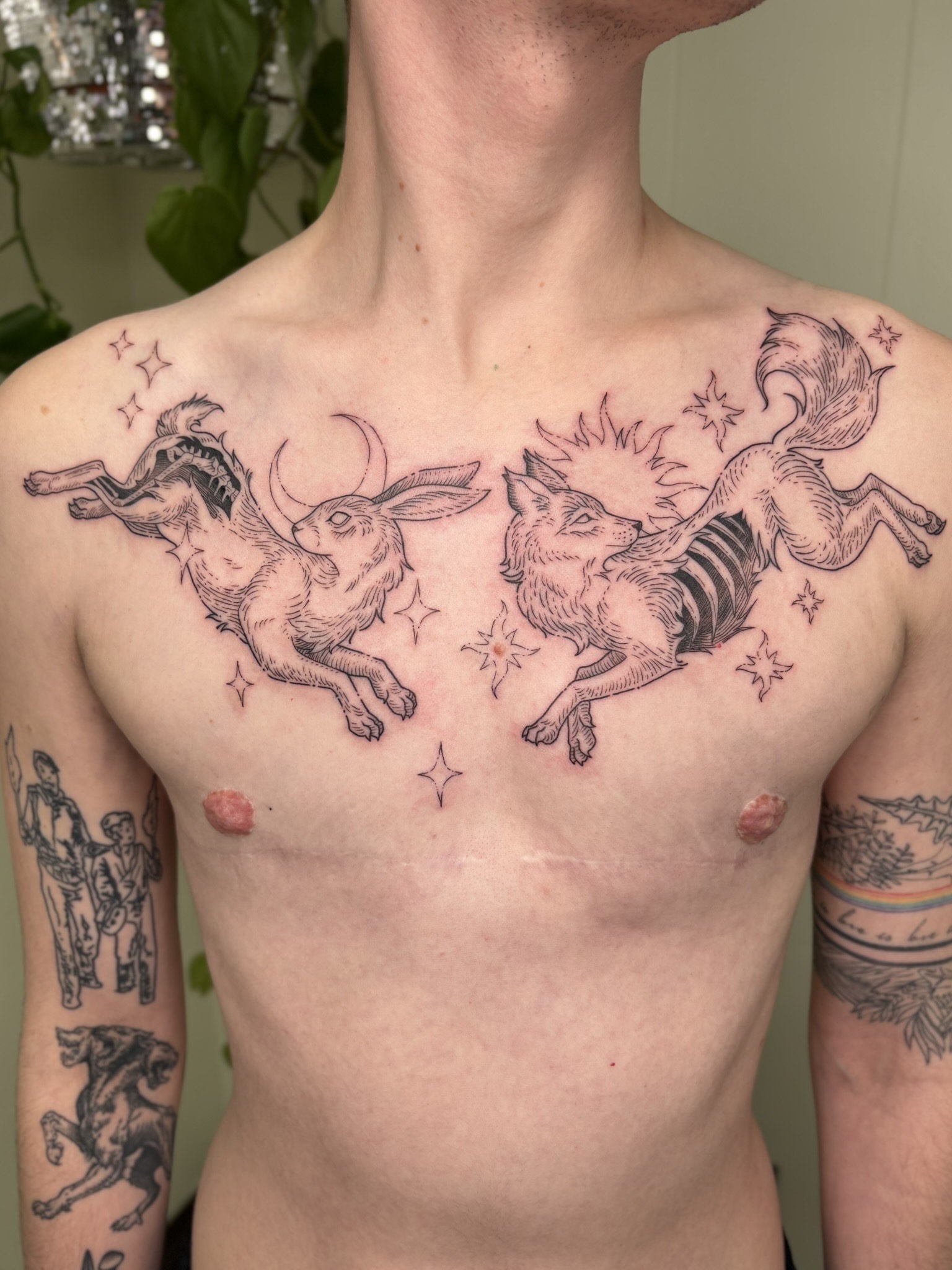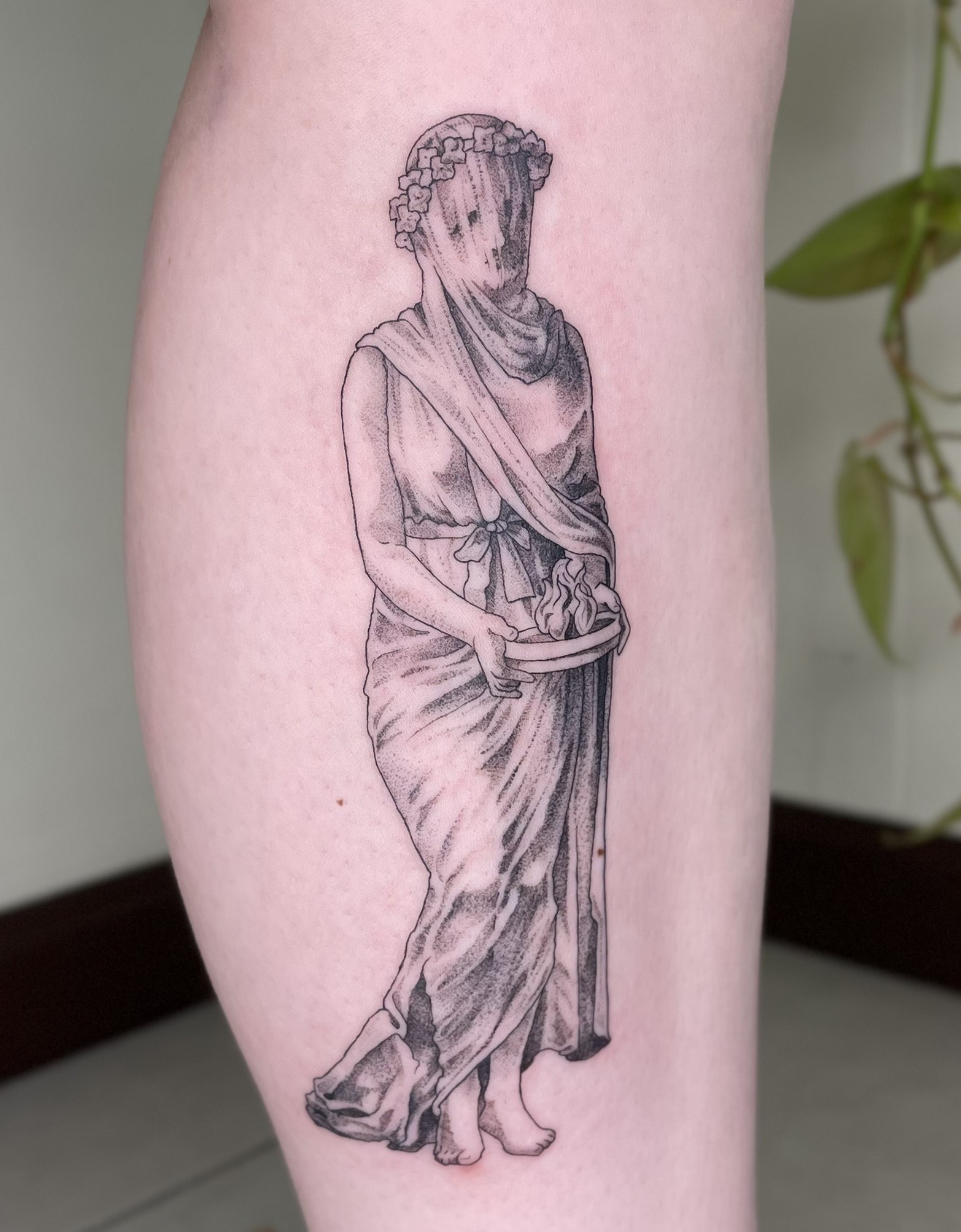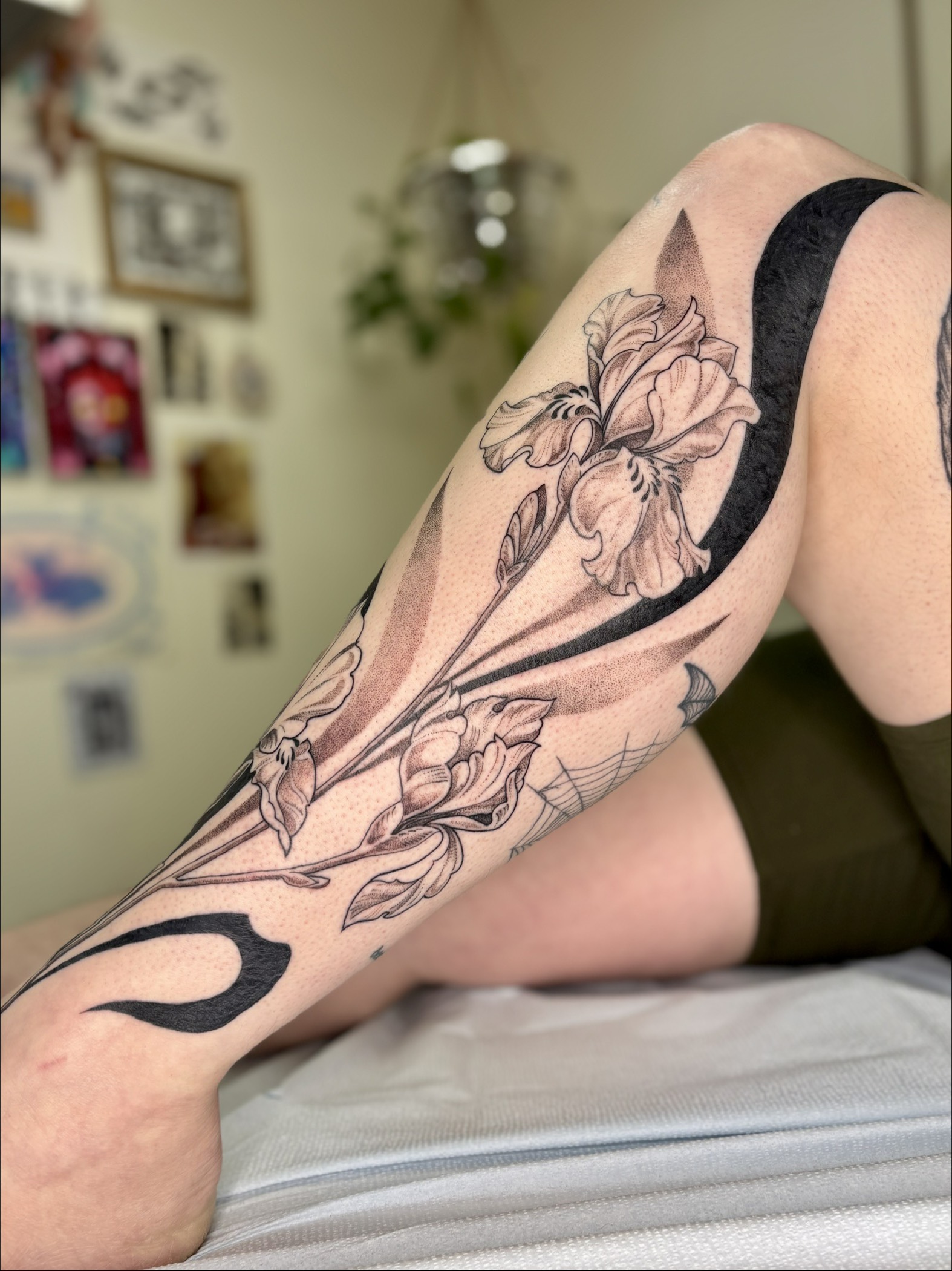 Gina started tattooing in 2018 but has been an artist as soon as she was old enough to smear paint on paper. Born and raised in St. Louis, she is beyond grateful to be able to tattoo in the city that she loves. She believes art can create transcendental moments of connection and excitement in ways that little else can, and tries to honor that in her work every day. She enjoys tattooing fine line black and grey pieces with pointillism or hatching. When she uses in color, she tends towards bold, neotraditional looks. She is inspired by scientific illustrations, queer romance, the human figure, lyrics, and the cycle of life & death.